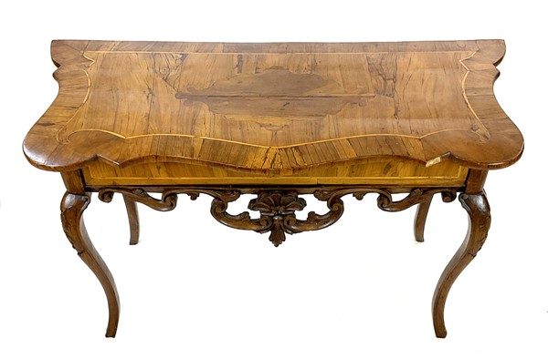 Antica console veneta in noce con piano sagomato e un cassetto nella fascia lastronati e filettati in radica, grembiale traforato e gambe mosse (cm 128x76x56) (difetti)