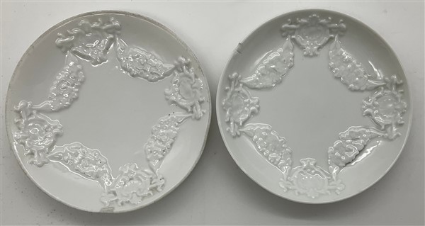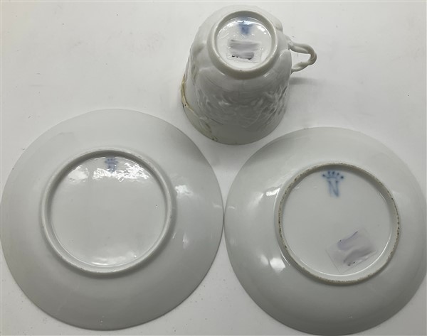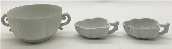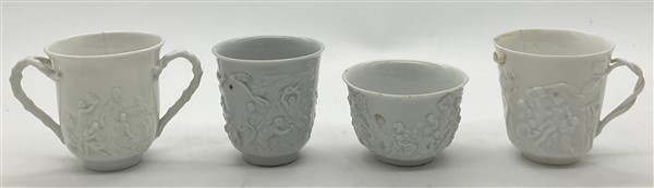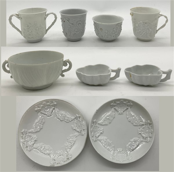 Manifattura di Ginori, Doccia, secolo XVIII-XIX. Lotto composto da quattro diverse tazze, due piattini, un tazza da brodo biansata e due coppette da sorbetto a foglia in porcellana bianca con decoro a rilievo (difetti, restauri e mancanze)