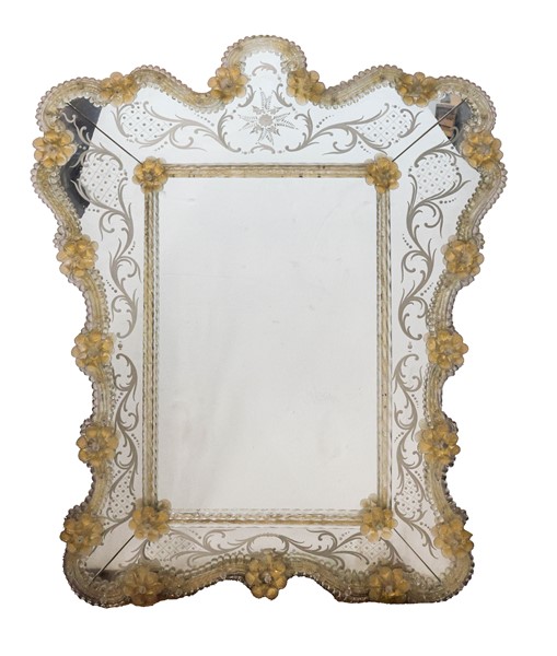 Manifattura di Murano. Specchiera di forma sagomata in vetro con cornice incisa e profili a canne ritorte intervallate da fiori (cm 64x95) (difetti)