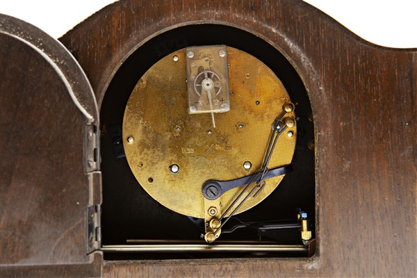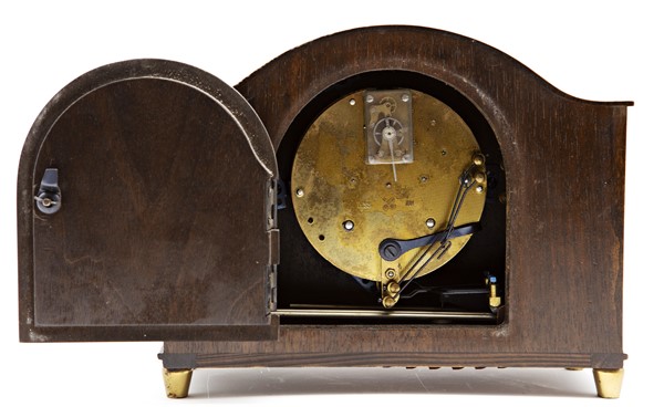 Orologio d'appoggio con cassa in legno sagomato, quadrante taforato a numeri romani. Movimento a bilanciere, suoneria su gong. Germania, anni 20/30 (cm 22x17,5x9) (difetti)