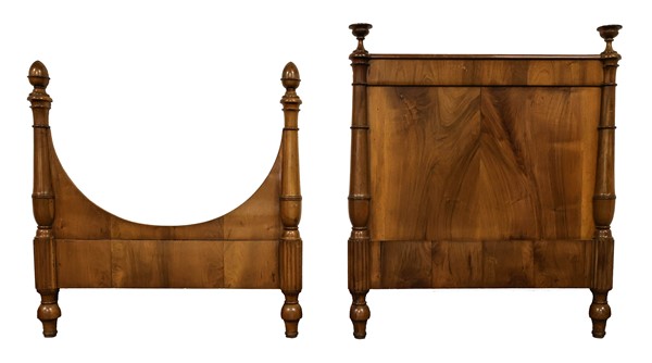 Letto singolo in noce con testiera cimata da vasi a coppa e pediera con pigne, montanti parzialmente scanalati. Secolo XIX. (cm 102x119x218) (difetti)