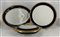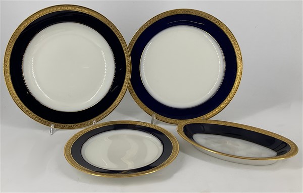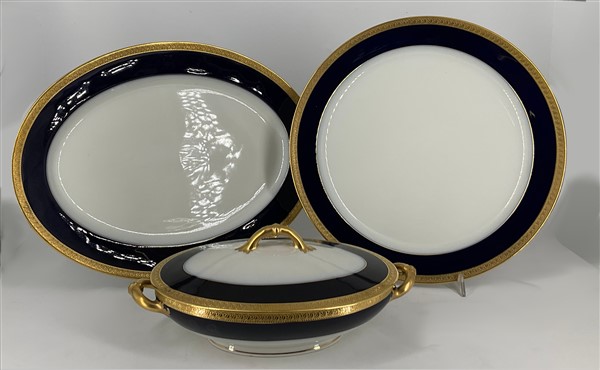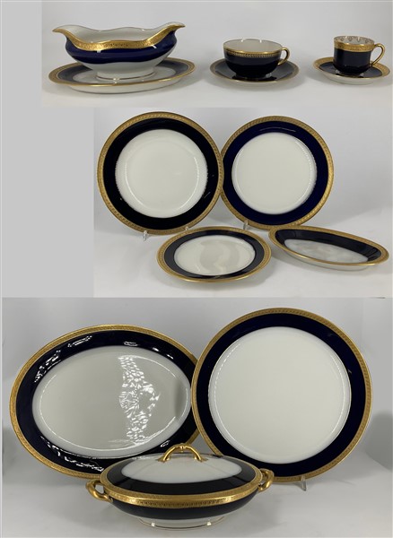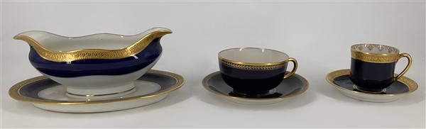 Manifattura di Limoges, F. Haviland. Servizio da tavola in porcellana con bordura in blu e profilo in oro composto da trentotto piatti piani, quindici piatti fondi, quindici piatti da dessert, dodici piatti da frutta, nove tazzine da caffè con undici piattini, una legumiera, coppia di salsiere, quattro raviere, coppia di piatti da portata tondi e coppia di piatti da portata ovali; unito a undici tazze da tè con tredici piattini di simile decoro. (difetti)