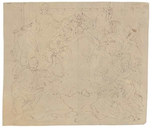 Anonimo del secolo XVIII "Madonna con Bambino e Santi in preghiera" penna con