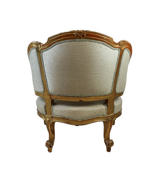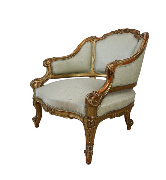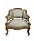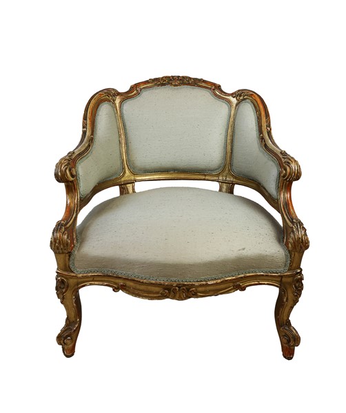 Poltroncina da camera a pozzetto in legno intagliato a volute di foglie con tracce di doratura (difetti)