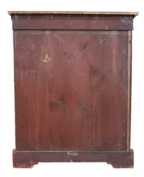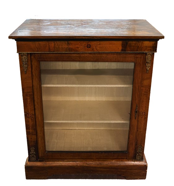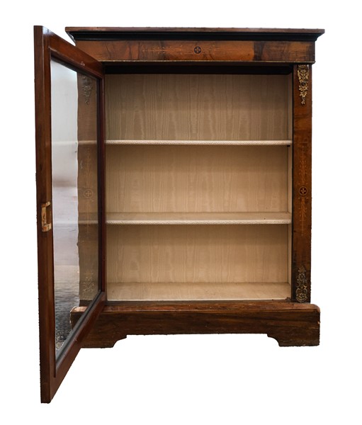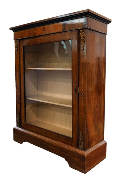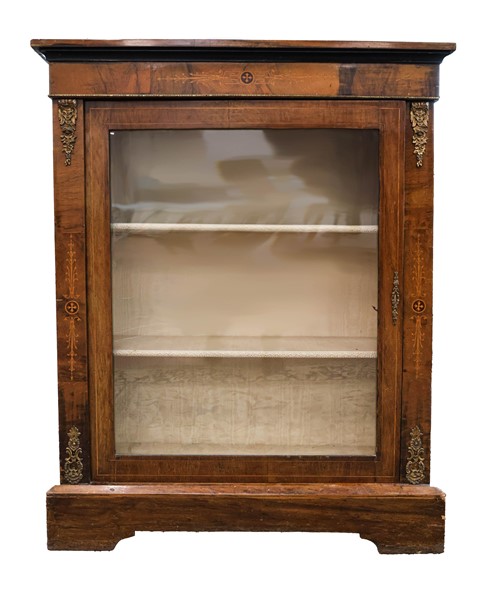 Vetrina a tre ripiani impiallacciata in noce con filettature e piccoli intarsi, guarnizioni in metallo e piedi a mensola. Secolo XIX-XX (cm 86x107x33) (difetti e mancante della serratura)