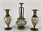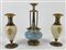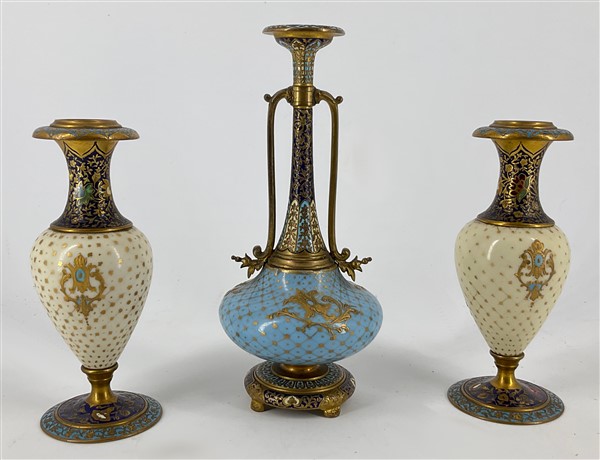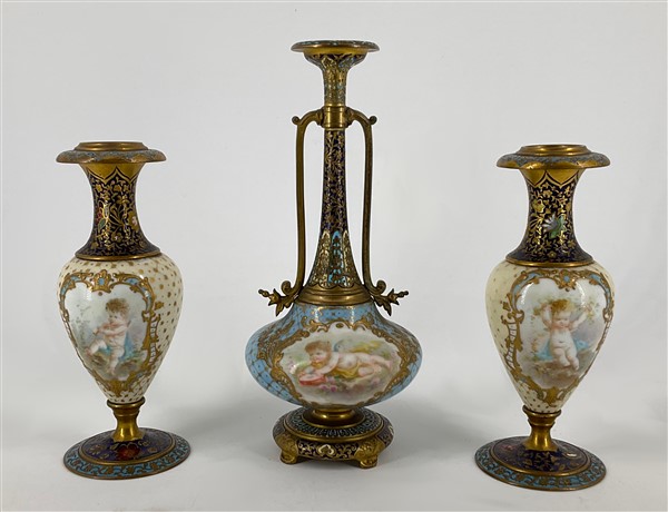 Lotto composto da coppia di vasi e un vaso biansato in porcellana policroma con decoro a putti entro cartiglio, collo, anse e base in bronzo decorato da smalti policromi. Vienna, inizio secolo XX (h max cm 20) (difetti)
