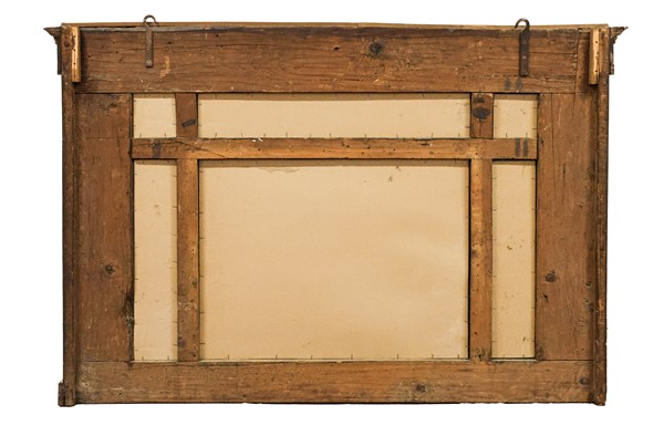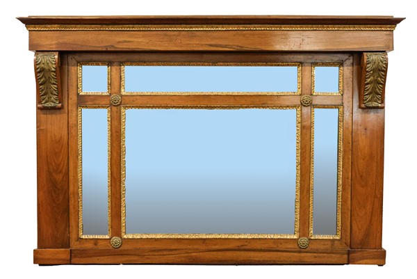 Caminiera in noce con specchi bordati a palmette dorate e applicazioni in lamierino a foglie d'acanto e umboni. Secolo XIX (cm 139x92x13) (difetti)