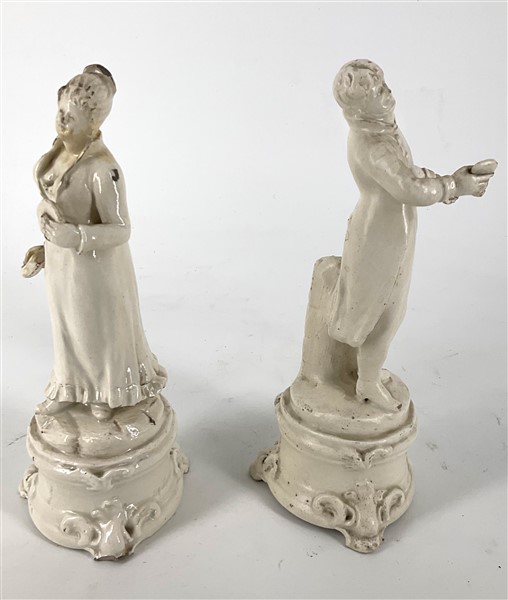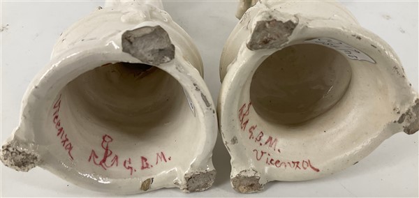 Manifattura G.B.M. Vicenza. Coppia di figure in terraglia smaltata bianca su base sagomata (h cm 19) (difetti e restauri)