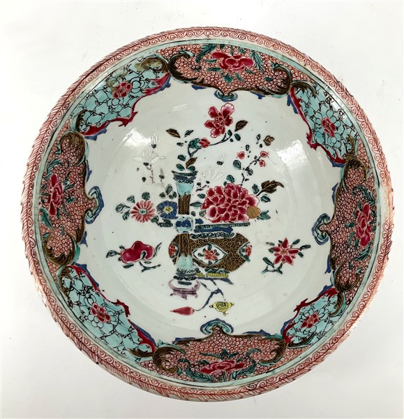 Ciotola in porcellana Famiglia Rosa decorata in policromia a motivo floreale e vaso nel cavetto e a riserve con motivi floreali nella bordura.