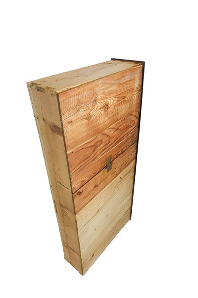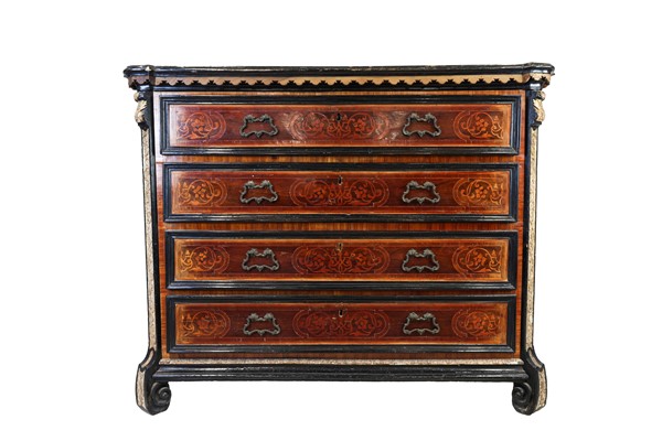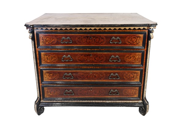 Cassettone in noce con fronte a quattro cassetti, specchiature radicate, filett
