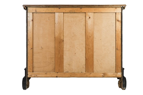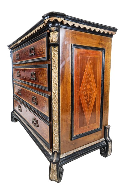 Cassettone in noce con fronte a quattro cassetti, specchiature radicate, filettate e decorati da piccoli intarsi, montanti e grembiale dorati. Lombardia, secolo XVIII. (cm 147x118x64) (gravi difetti e sostituzioni)