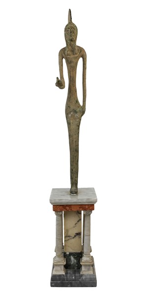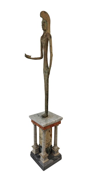 Statua dall'antico in bronzo su base in marmi policromi con sostegni a colonna (h cm 89) (difetti e restauri)