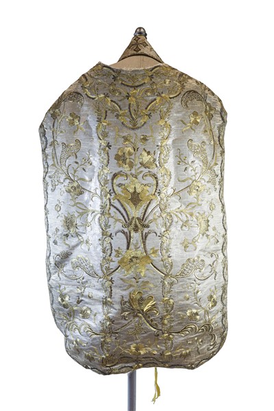 Pianeta con stola. Italia, prima metà secolo XVIII. Confezionate con un tessuto in seta a doppio corpo laminato in argento con ricami eseguiti con filo d'argento dorato e lamine di metallo dorato a formare rami fioriti, volute e disegni di ispirazioni bizzarre. Foderato in taffetà di seta gialla (h. cm 109) (difetti e restauri)