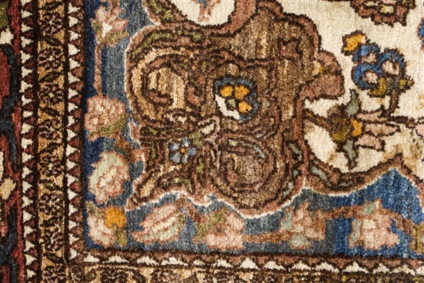 Tappeto Teheran, Persia, secolo XX. Decoro con medaglione con puntali a fondo blu su campo bianco (cm 202x134) (difetti)