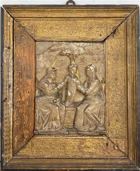 Manifattura di Malines, secolo XVIII. La vergine con Bambino e Sant'Anna. Rilievo in alabastro con lumeggiature in oro (cm 12x10) In cornice antica (cm tot 22x19) (difetti e restauri).