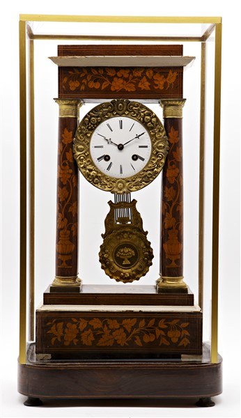 Orologio da appoggio a portico in legno e bronzo dorato. Cassa impiallacciata e interamente intarsiata a vasi, tralci di vite e foglie.