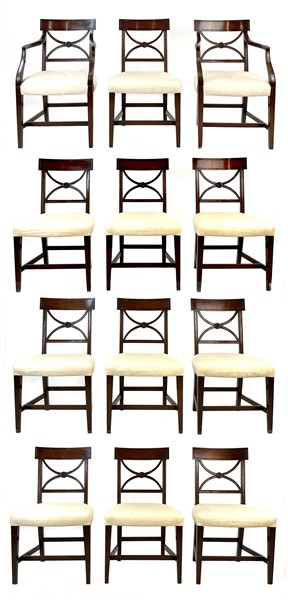 Gruppo di dieci sedie e coppia di poltrone in mogano con schienale a giorno e c