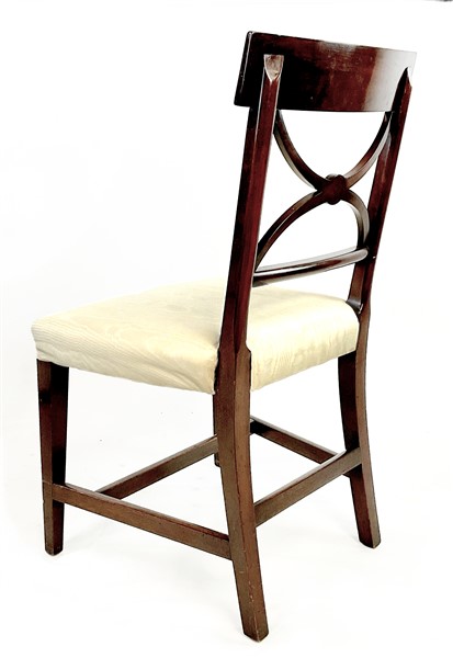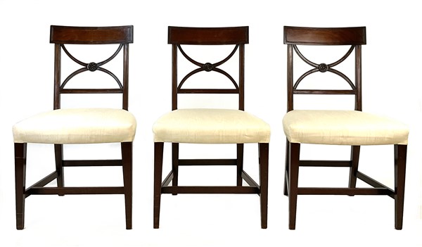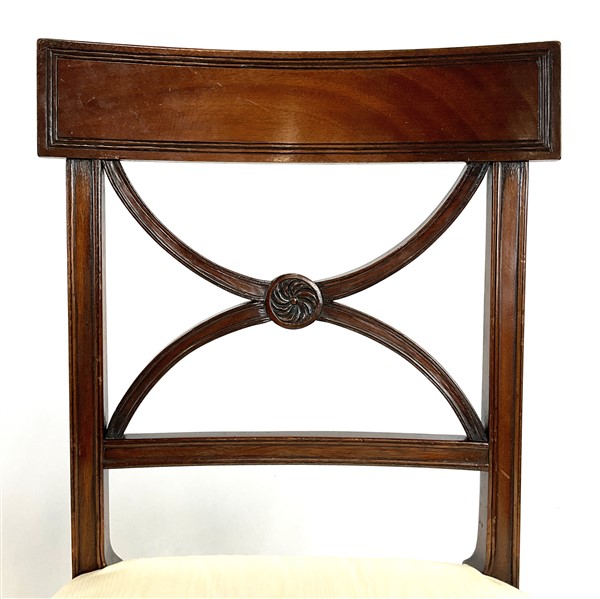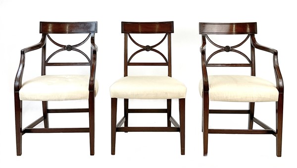 Gruppo di dieci sedie e coppia di poltrone in mogano con schienale a giorno e cartella a volute incociate. Inghilterra, inizio secolo XX (difetti)
