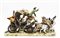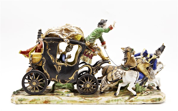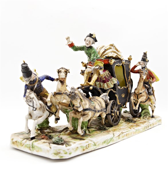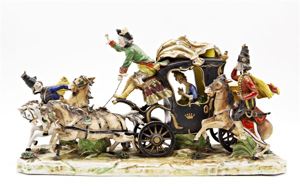 Gruppo in porcellana policroma raffigurante carrozza trainata da cavalli e cava