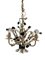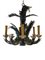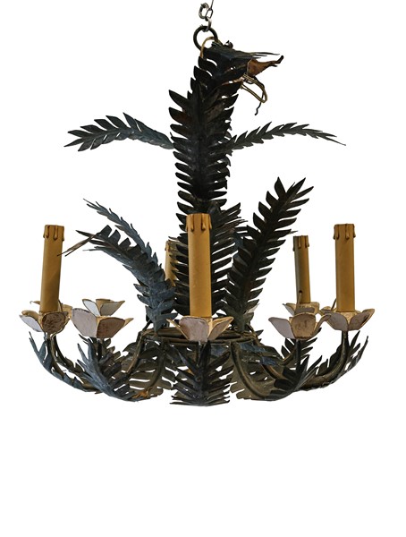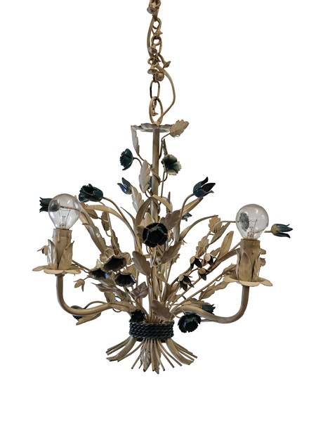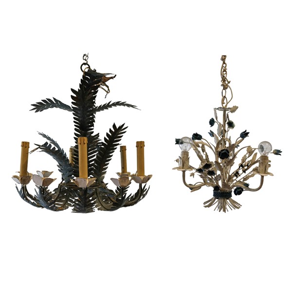Lotto composto da due lampadari in ferro e lamierino dipinto di cui uno a dieci luci e uno a tre, decori a foglie e fiori (h max cm 60) (difetti)