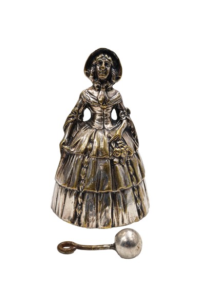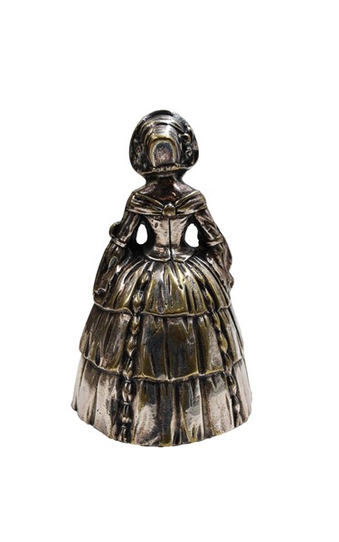 Campanello in metallo argentato in forma di gentildonna con ampia gonna (h cm 11,5) (batacchio staccato)