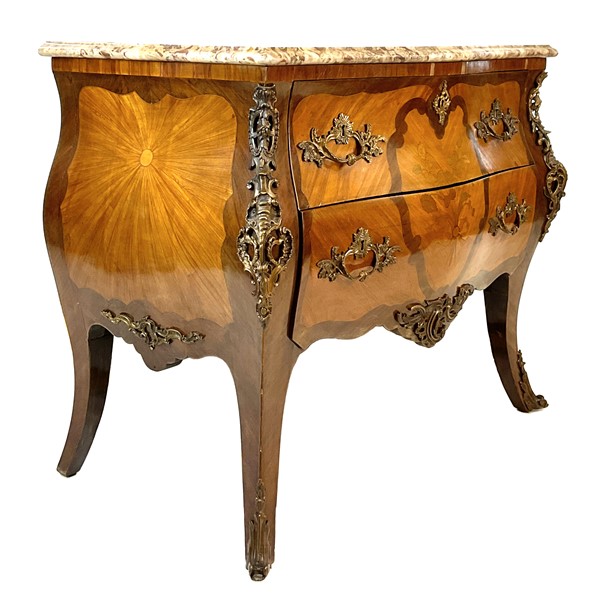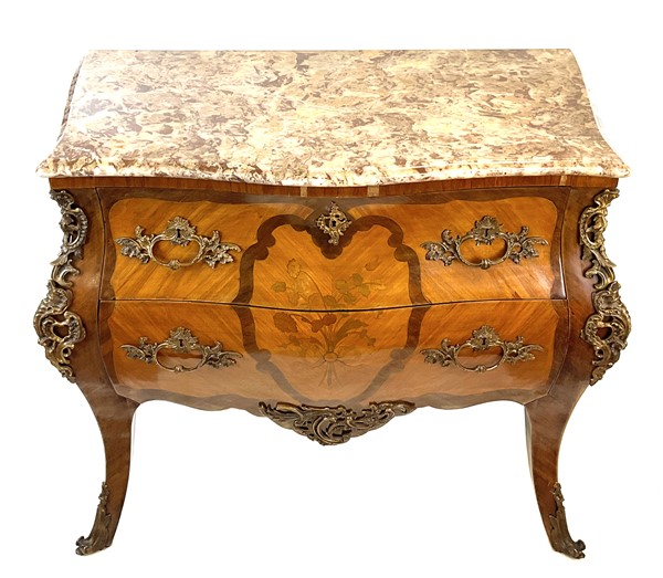 Cassettone bombato e impiallacciato con decori ad intarsio in legni vari a motivo floreale entro riserve, fronte a due cassetti e guarnizioni in metallo dorato, piano in marmo. (cm 106x90x60) (difetti)