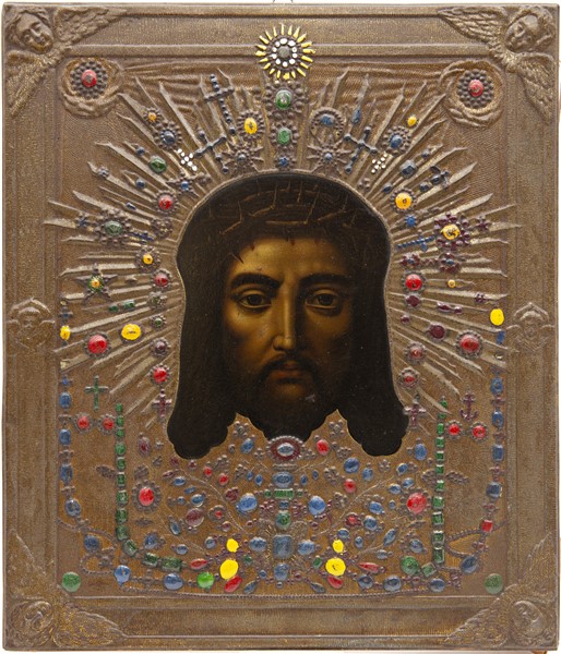 Scuola di San Pietroburgo, metà del secolo XIX. Icona ''Mandylion'' raffigurante Volto di Cristo, riza in metallo sbalzato e dipinto in policromia. (cm 31x27) (lievi difetti)