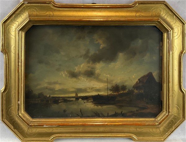 Scuola nordica del secolo XIX "Paesaggio" olio su cartoncino applicato su tavo