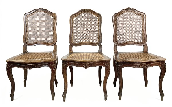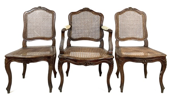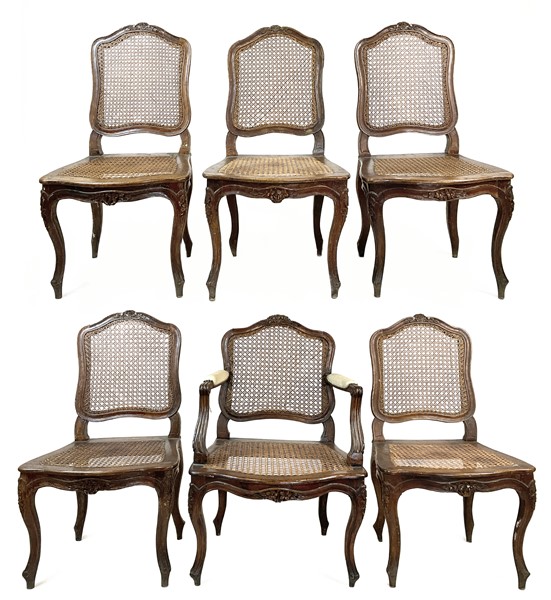 Lotto composto da cinque sedie e una poltrona in legno intagliato con sedute e schienale in paglia di Vienna, bordure scanalate e decorate a motivo floreale, gambe mosse. Secolo XVIII (difetti)