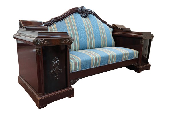 Divano in mogano con schienale mosso e fascia intagliata, sponde di struttura architettonica con sportelli tra semicolonne. Inghilterra, secolo XIX (cm 248x110x86) (difetti e mancanze)