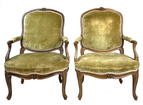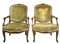 Coppia di poltrone in legno intagliato con bordure scanalate e decorate a motivo floreale, braccioli e gambe mosse terminanti a ricciolo. Secolo XVIII (difetti)