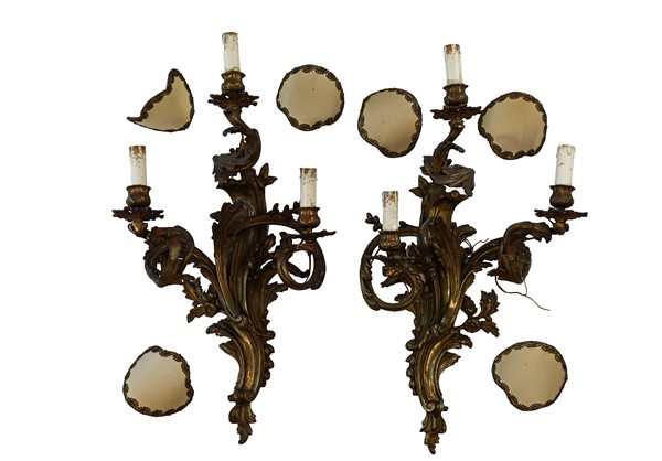 Coppia di appliques in bronzo dorato a tre fiamme con bracci a voluta. Secolo XIX (h cm 55) adattati a luce elettrica in epoca successiva. (difetti)