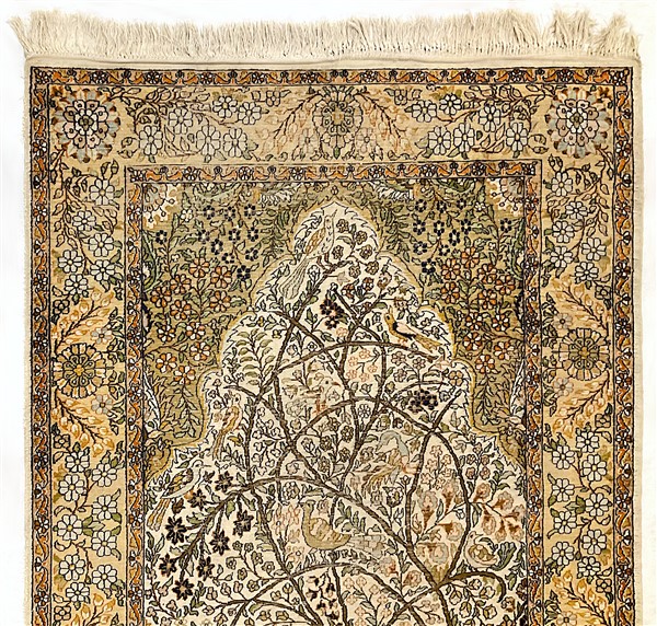 Tappeto preghiera Herekkè, Anatolia, inizio secolo XX. Annodato in seta su trama e ordito in cotone. Mirab decorato con albero della Vita e animali su fondo bianco (cm 185x120) (difetti e rapature)