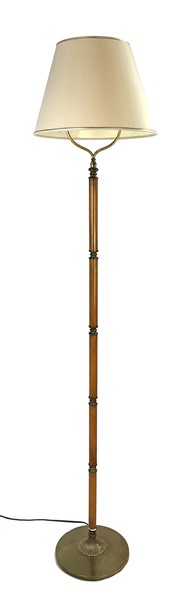 Piantana con struttura in bachelite e ottone, paralume non coevo in tessuto bianco (h tot cm 170). (lievi difetti)