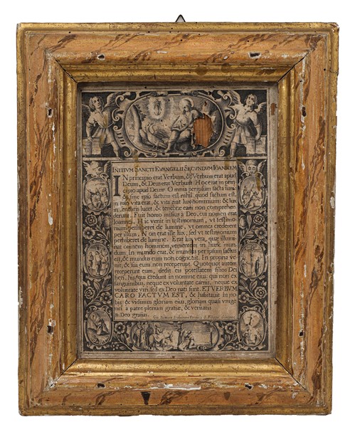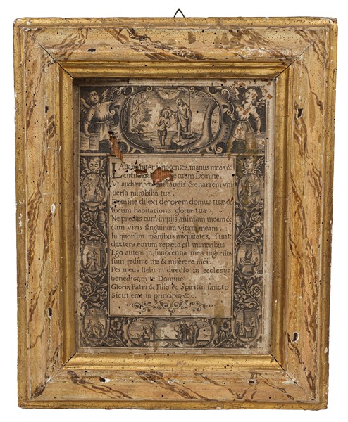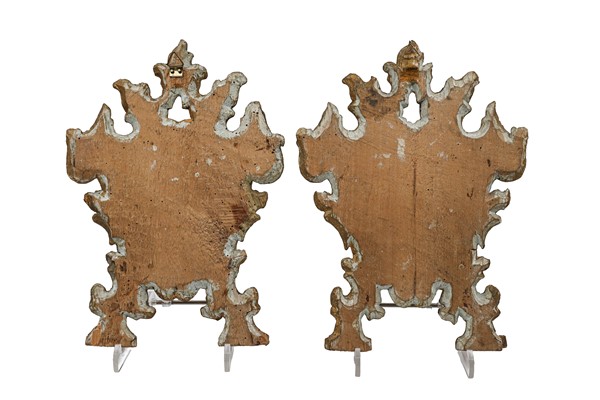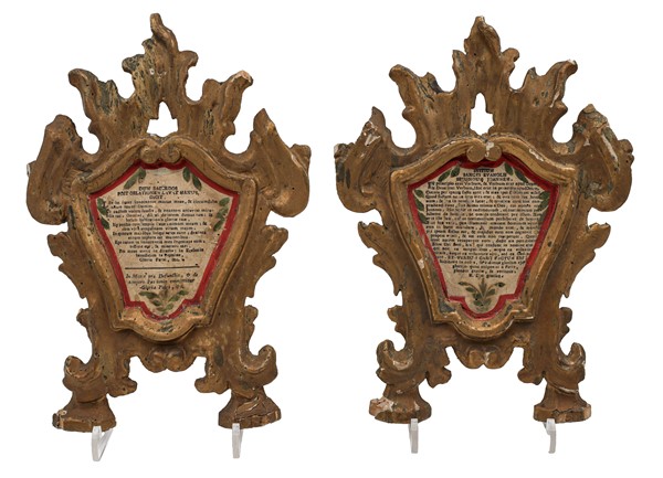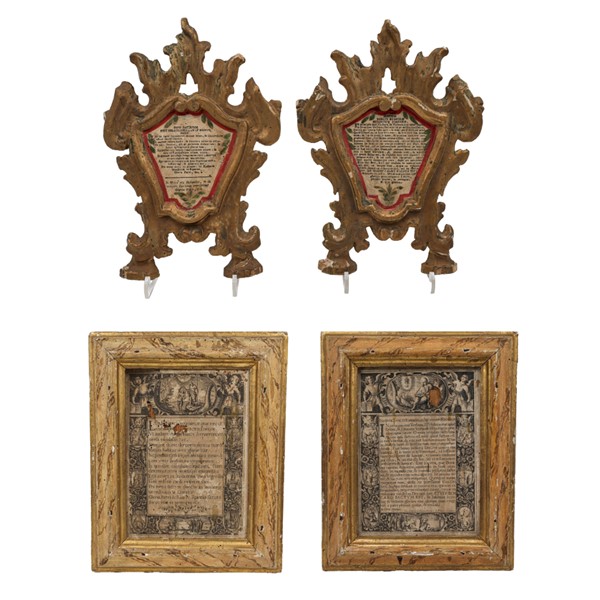 Lotto composto da una coppia di cornici in legno laccato a finto marmo con profili dorati (cm 34x28) contenenti antiche incisioni e una coppia di cartaglorie in legno sagomato e dorato. Secolo XVIII (difetti e mancanze)