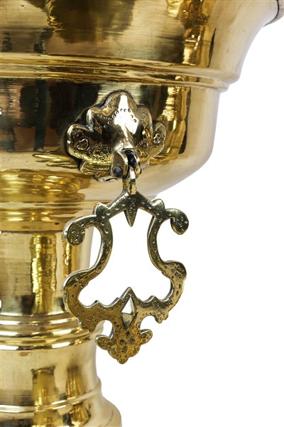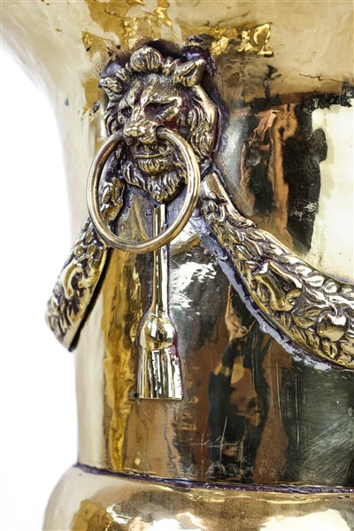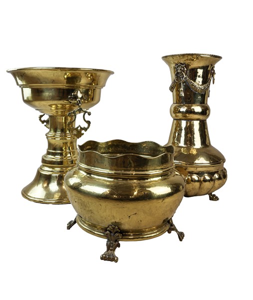 Lotto composto da due vasi e un braciere in ottone, braciere con anse basculanti e un vaso con piedi ferini ed anse a teste leonine anellate (h max cm 63) (difetti)