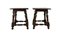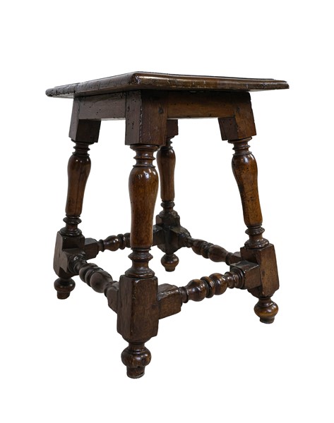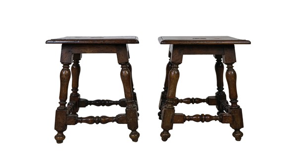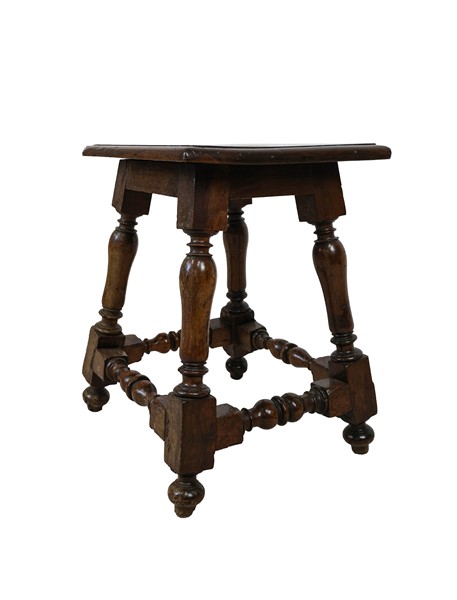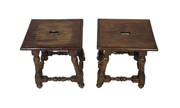 Coppia di sgabelli in noce con gambe e traverse di raccordo tornite a rocchetto. Secolo XVIII (cm 39x47x33) (difetti)