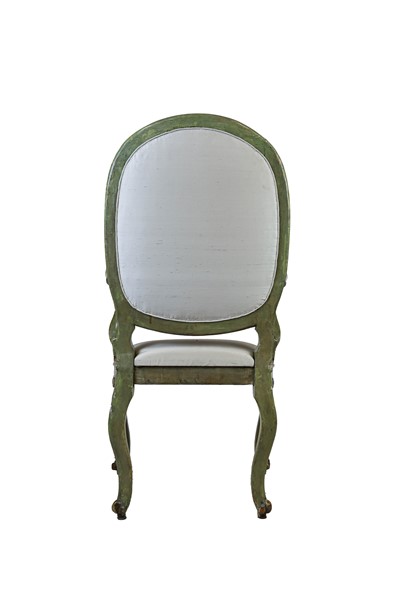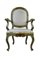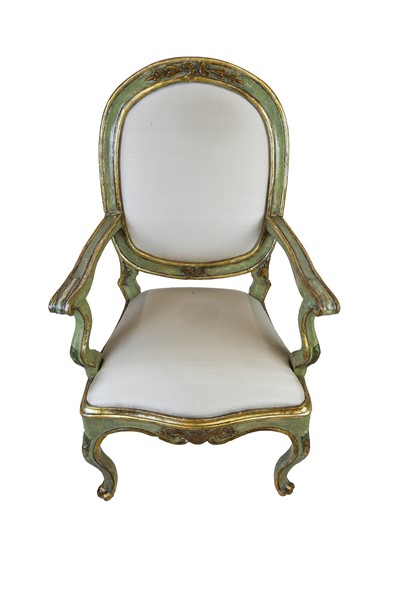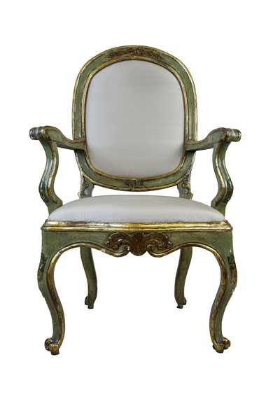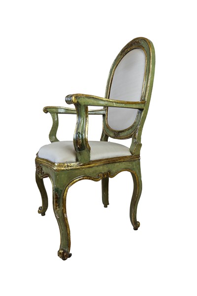 Poltrona in legno intagliato, laccato e dorato con schienale a medaglione, braccioli e piedi terminanti a ricciolo. Secolo XVIII (difetti e restauri)