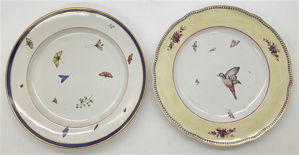 Manifattura di Ginori, Doccia, secolo XVIII-XIX. Due piatti in porcellana dipinta in policromia a insetti, volatili e fiori, profili in oro (d max cm 24) (difetti e restauro ad un piatto)