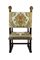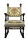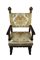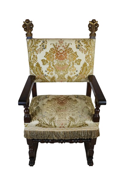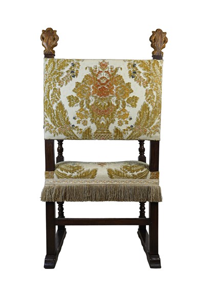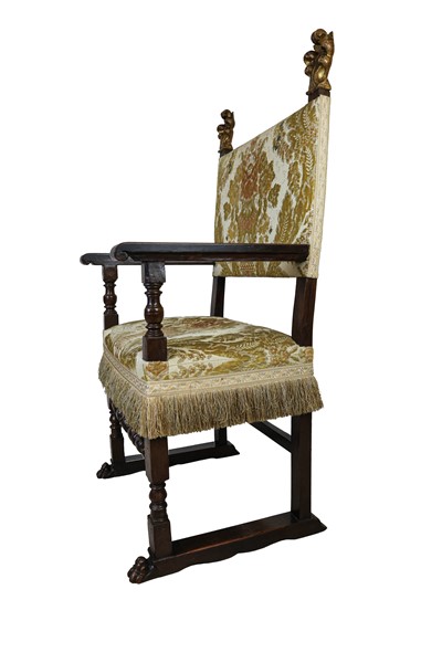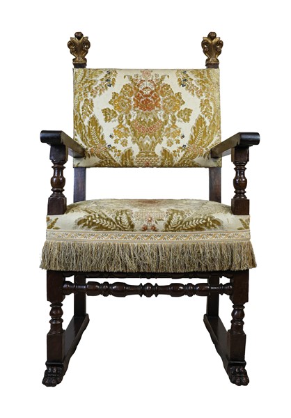 Seggiolone in noce costruito con elementi antichi, gambe anteriori e traversa tornita su piedi ferini, pennacchi a foglia dorata (difetti)