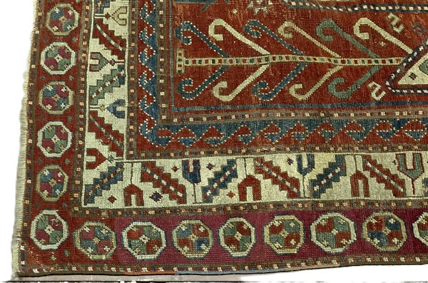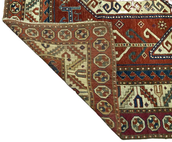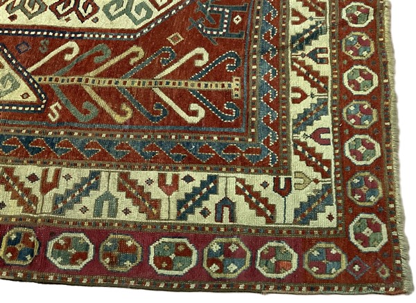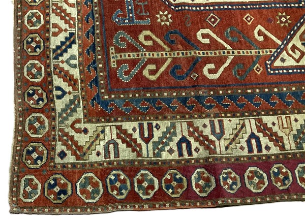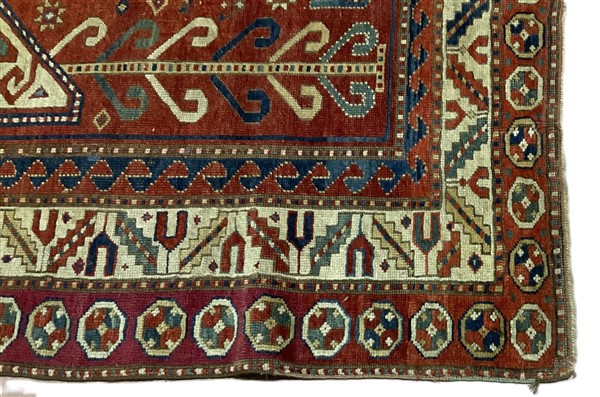Tappeto Kazak Sevan, Caucaso, fine secolo XIX. Decoro con un medaglione a fondo verde bordato di bianco su campo rosso. Bordura principale a calici su foglie dentate a fondo bianco (cm 257x183) (difetti)