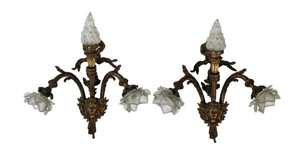 Coppia di applique a tre luci in bronzo con paralumi a fiore e fiamma in vetro, attaccatura a volto muliebre e nastro, inizio secolo XX. (h cm 47) (difetti e piccole rotture)