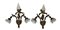 Coppia di applique a tre luci in bronzo con paralumi a fiore e fiamma in vetro,