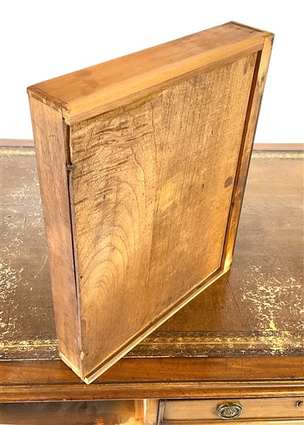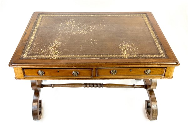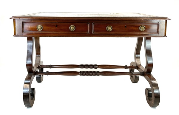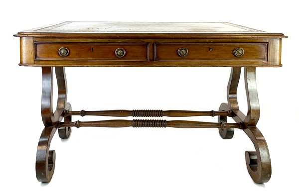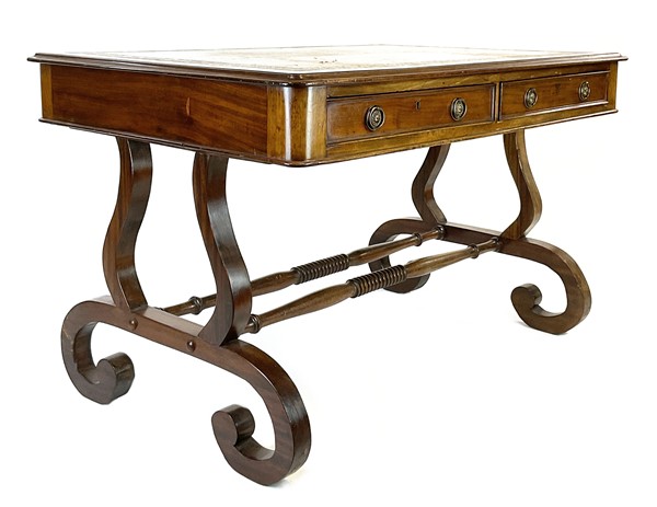 Scrittoio da centro in mogano con gambe a volute contrapposte riunite da traverse tornite, due cassetti nella fascia su ambo i lati, piano con riserva in pelle e bordura impressa. Inghilterra, secolo XIX (cm 121x78x86) (difetti)