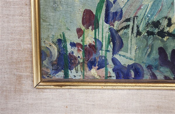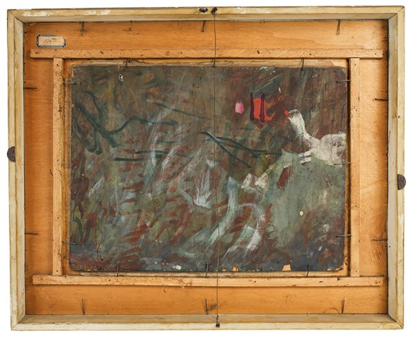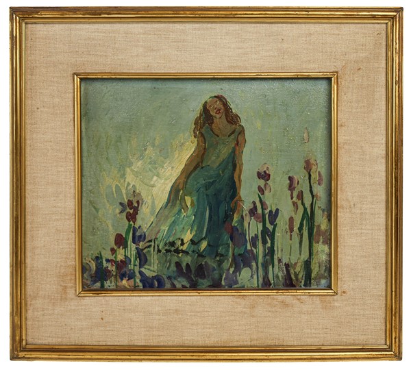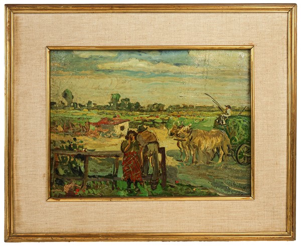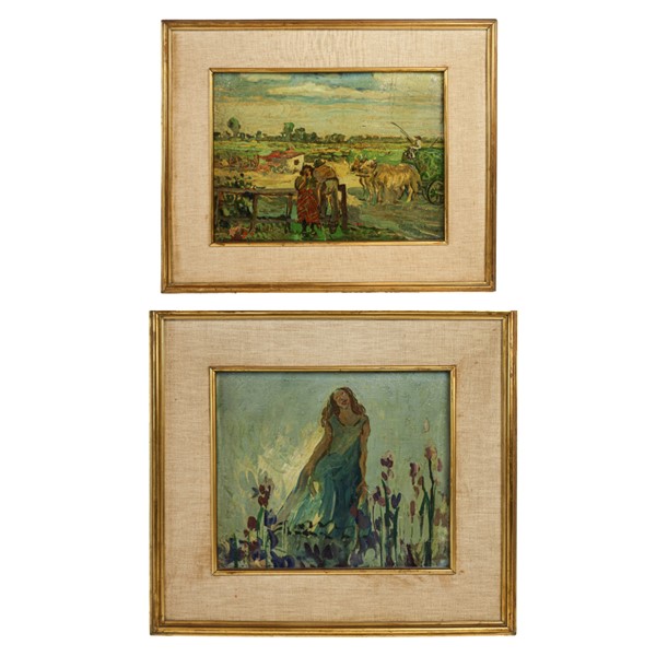Lotto composto da due dipinti ad olio su compensato raffiguranti "Paesaggio agreste con contadini e buoi" e "figura femminile in un paesaggio" di misure diverse (misura max cm 32x43) uno solo firmato e iscritto al retro
