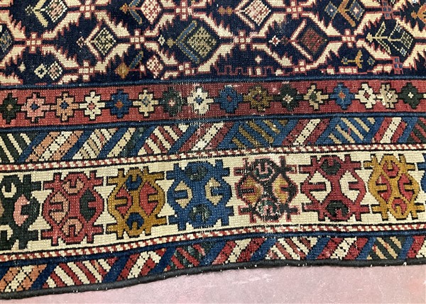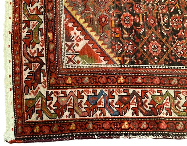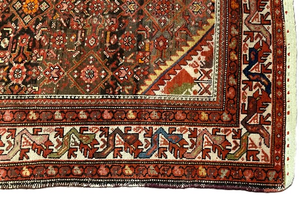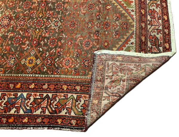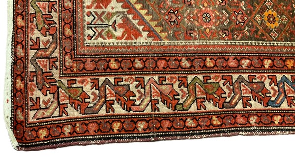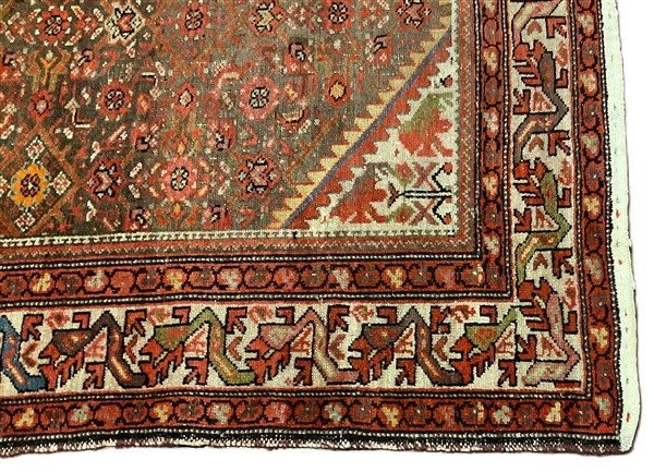 Tappeto galleria Ferahkan, Persia, secolo XX. Decoro Herati su campo blu e verde, bordura principale a meandro su fondo bianco (cm 248x135) (difetti e buchi)