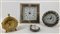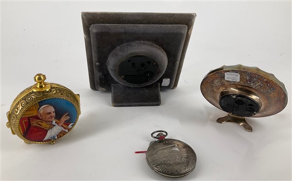 Lotto composto da quattro diversi orologi d'appoggio di cui due con cornice in lamina d'argento, uno Imhof Trianon in metallo dorato con effigie di papa Giovanni XXIII a smalti policromi al verso ed un orologio da tasca Wille Frères (difetti)