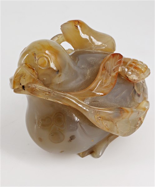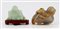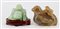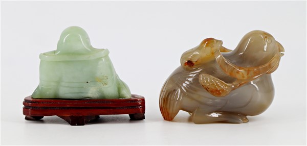 Lotto composto da due intagli in pietra dura raffiguranti Budai e volatile