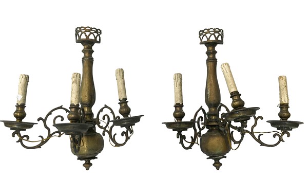 Cartone contenente coppia di applique a tre luci in bronzo e coppia di ferri da