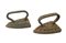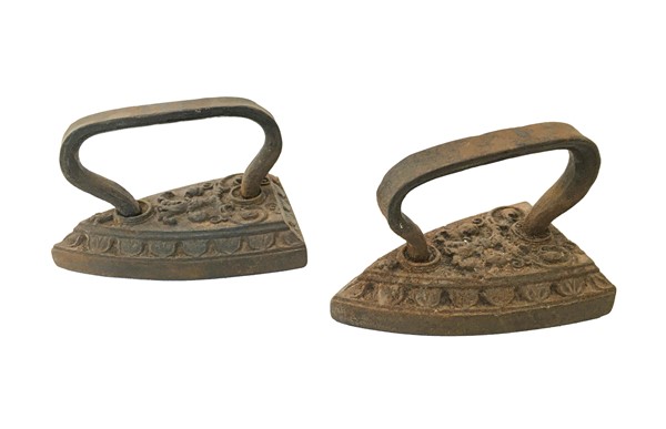 Cartone contenente coppia di applique a tre luci in bronzo e coppia di ferri da stiro in ferro (gravi difetti)